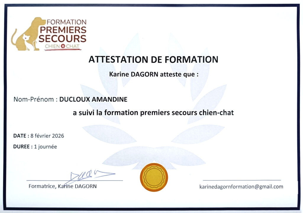 Afin de concrétiser cette orientation, j’ai suivi la formation ACACED (Attestation de Connaissances pour les Animaux de Compagnie d’Espèces Domestiques : chiens, chats et NAC) et obtenu mon diplôme.